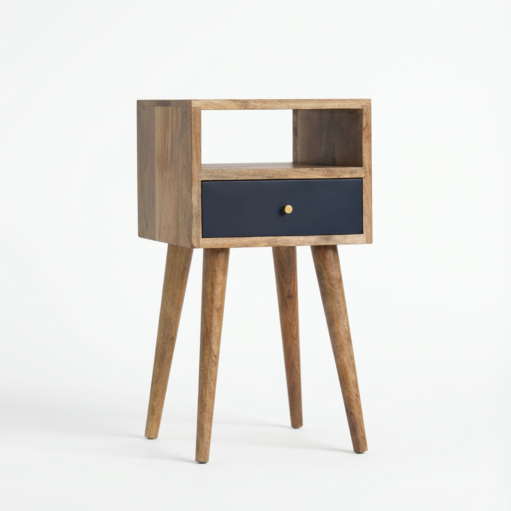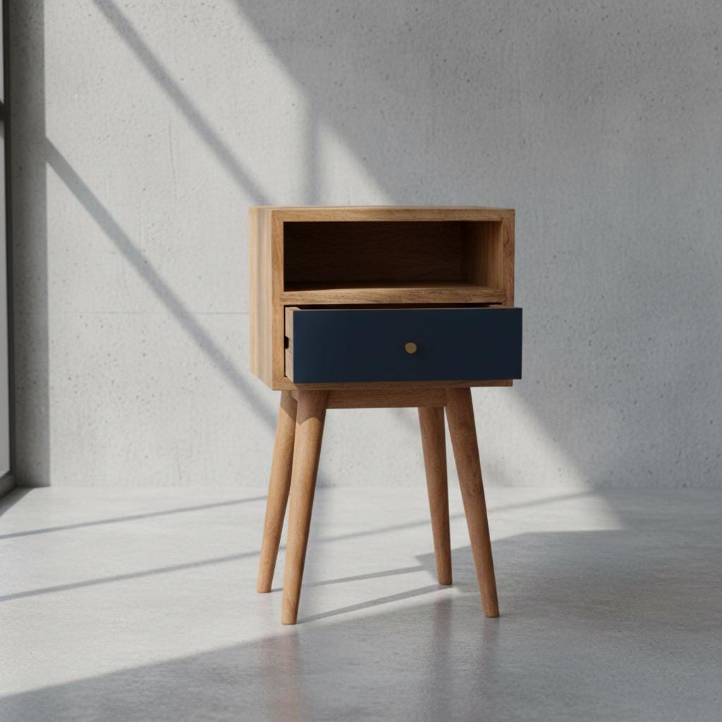 It is intended for placement next to a bed or in other indoor living spaces for light storage and surface use.