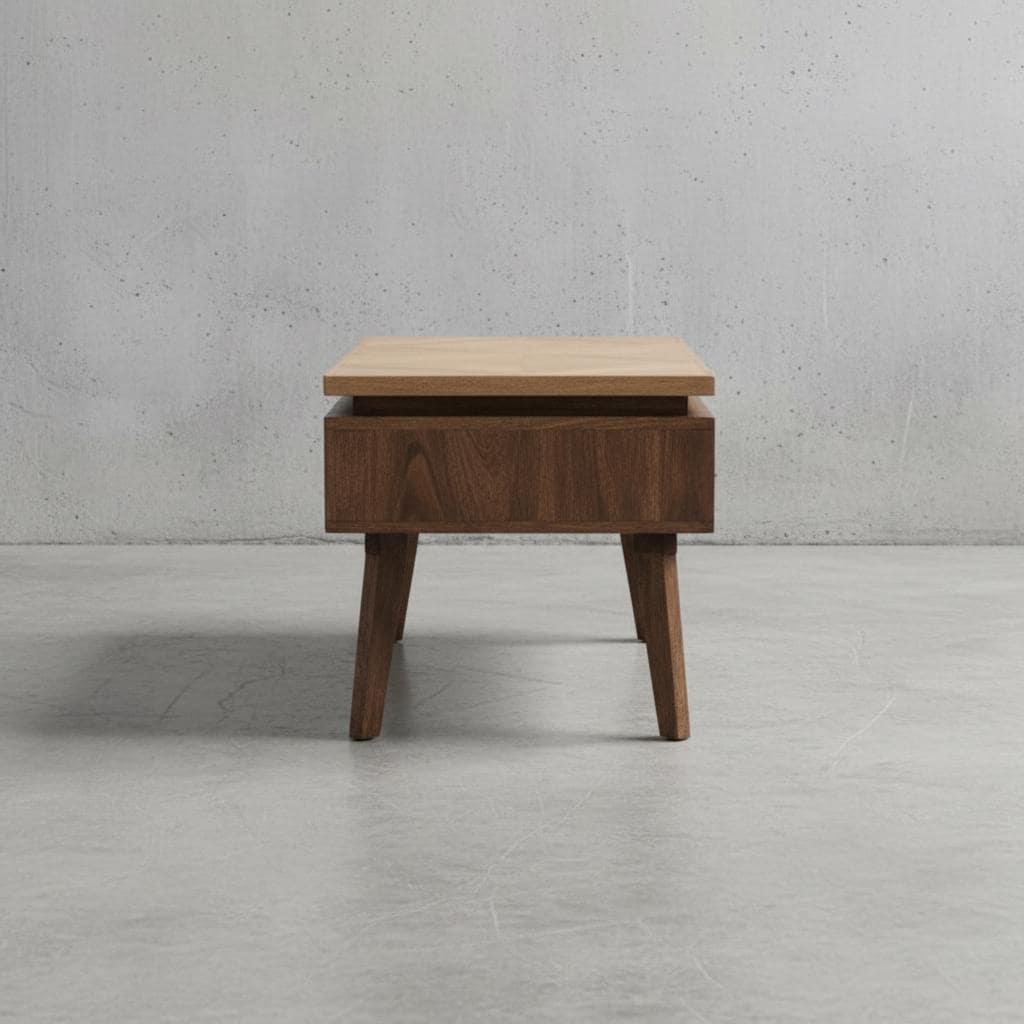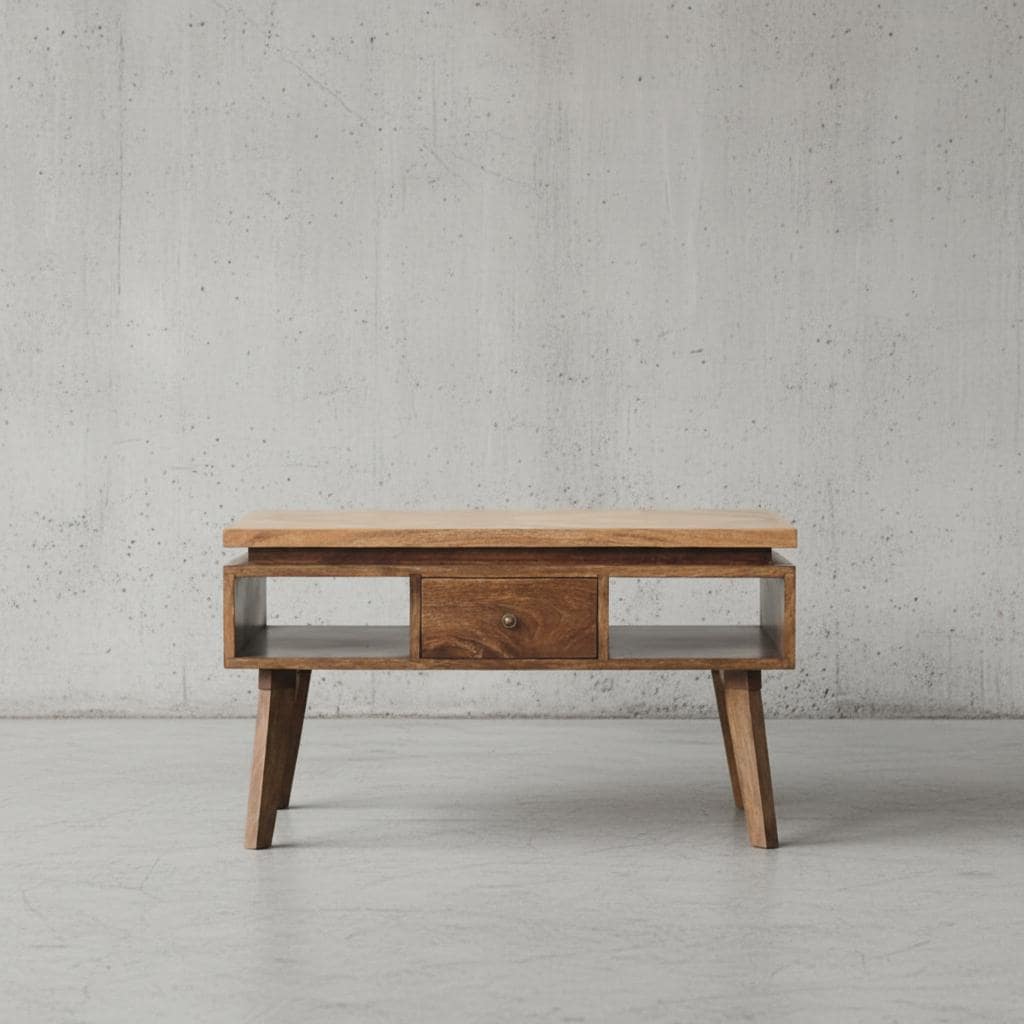 It features a rectangular tabletop with one integrated drawer and a lower storage area.