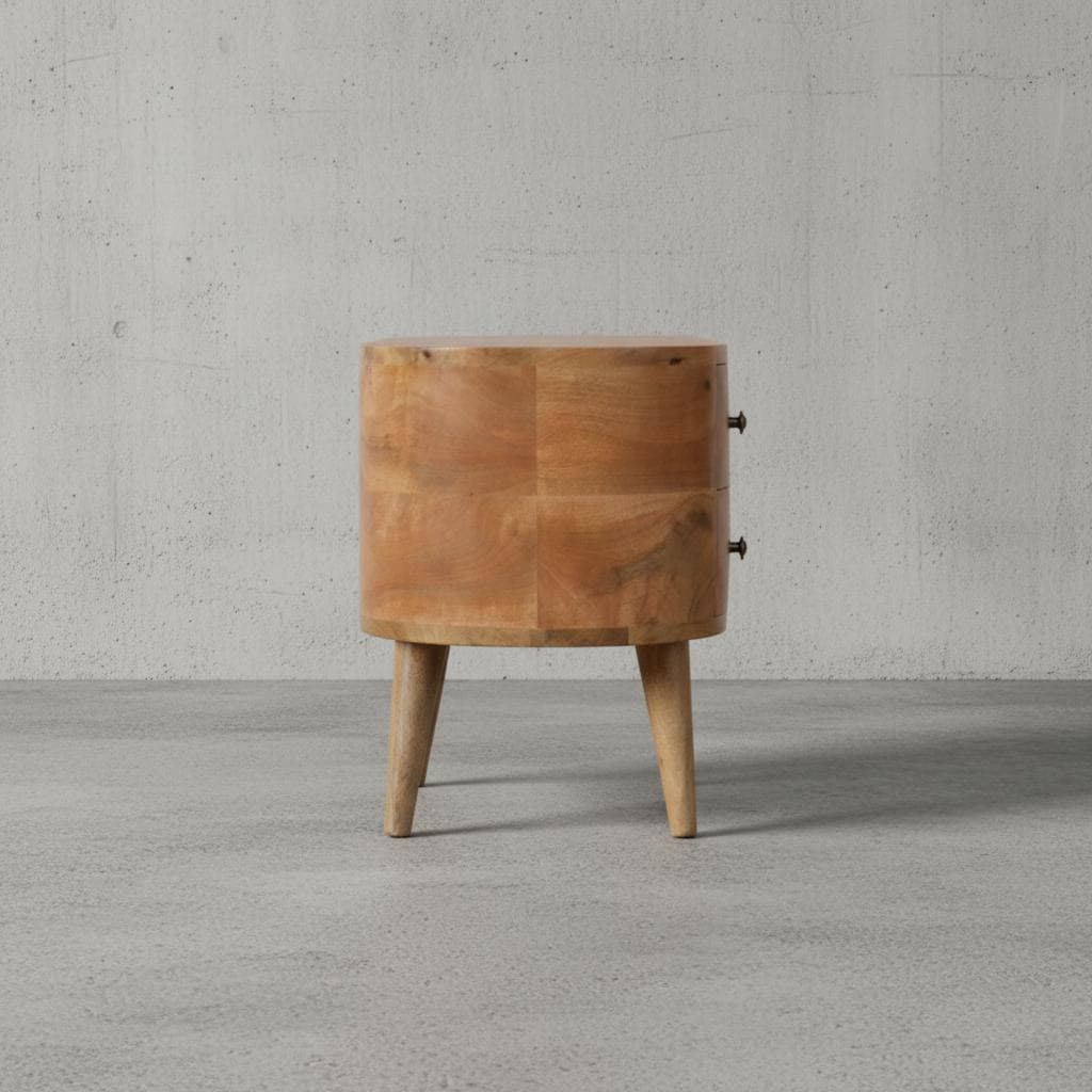 It features a low rectangular structure with rounded edges, multiple drawers, and open shelf compartments.
