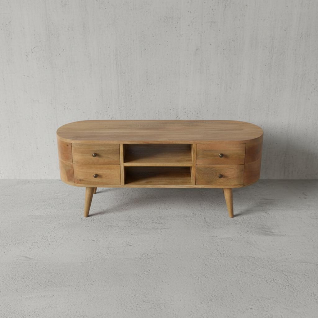 This wooden TV media unit is designed for indoor residential use.